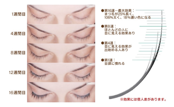 • 使用を中止すると、数週間から数ヵ月かけて、 まつげの平的的な毛周期に伴い、徐々に元のまつげに戻っていきます。